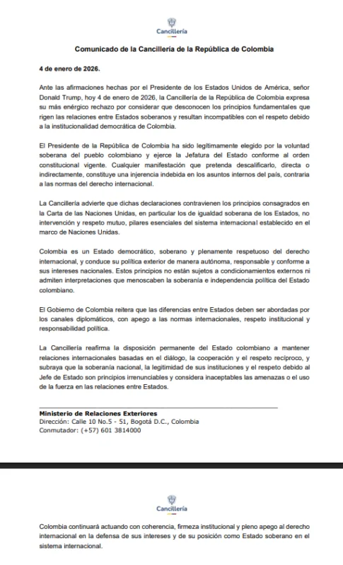 El Gobierno Nacional expresó este 4 de enero de 2026 su más enérgico rechazo a las afirmaciones realizadas por el presidente de Estados Unidos, Donald Trump, al considerar que desconocen los principios fundamentales que rigen las relaciones entre Estados soberanos y vulneran el respeto debido a la institucionalidad democrática colombiana.