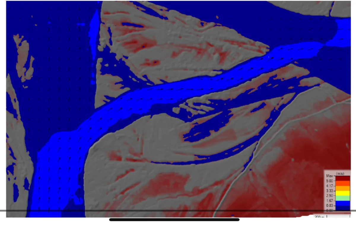 En la gráfica se aprecia el campo de velocidades en el río Cauca tras la ampliación del canal. Las tonalidades de azul claro representan las mayores velocidades del flujo de agua, lo que evidencia una tendencia preferencial del caudal por el Canal de La Esperanza.