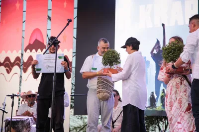Durante el evento «Raíces de la dignidad: memoria viva de las luchas agrarias de la Unión Patriótica», la Ministra de Agricultura y Desarrollo Rural de Colombia, Martha Carvajalino, hizo entrega del reconocimiento como «Embajadores por la Tierra» a Mario Muñoz (Subcantante) y David Jaramillo (David Kawooq).
